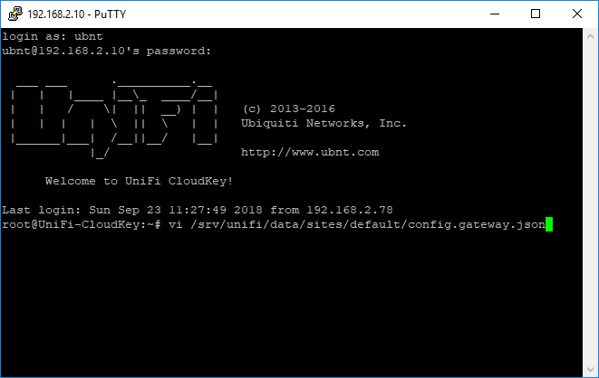 Next type: vi /srv/unifi/data/sites/default/config.gateway.json - Note that if you have multiple sites or your site name is not default. Change it so it fits your use case.