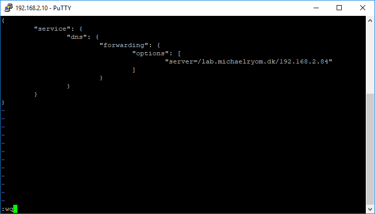 Note that all you need to change is the domain, in my case lab.michaelryom.dk and what dns server to forward requests to, here 192.168.2.84.