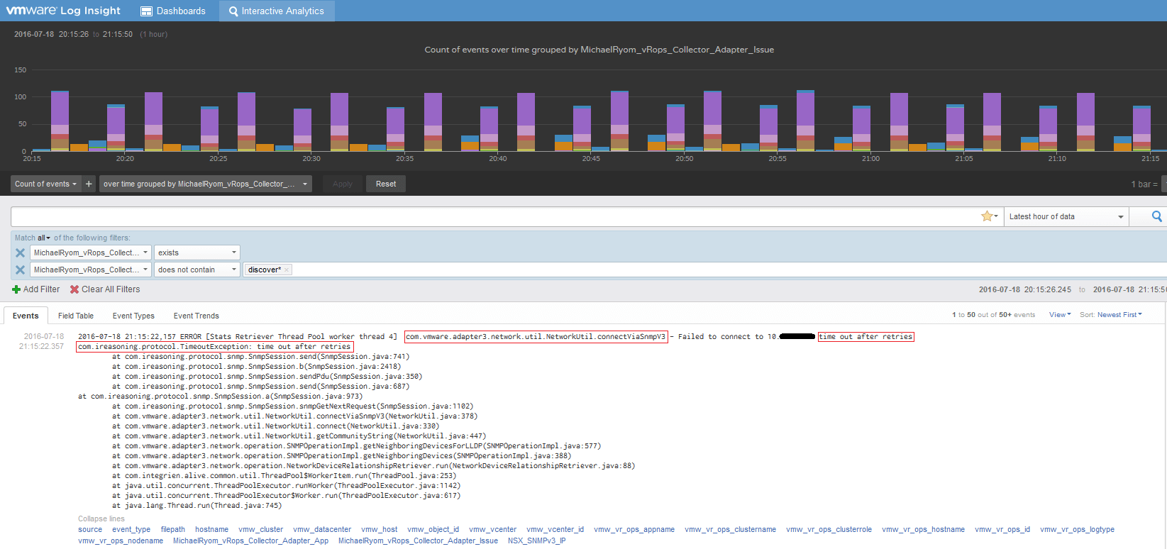 I have clicked on one of the widgets and what you see below is just a single log message. I have highlighted what is interesting in this log message. Also note that the IP address of the device which have the issue is clearly visible even though I have here hidden some of the IP address. So now we know what device, but for some reason it isn't getting monitored in the way that have been configured in vRops. Next is to figure out why. Looking at the highlighted texts. Starting with the first one. Here we see that it is regarding "network" and "connectViaSnmpV3", because of this we now know it's network related and that it tries to connect via SNMP V3. Next highlight "time out after retries", so the cause for this error is a time out after multiple retries. Almost there, looking at the last highlight we see almost the same. There you have it, now it just a matter of figuring out why it times out. It could be as simple is SNMP V3 isn't configured on the device.