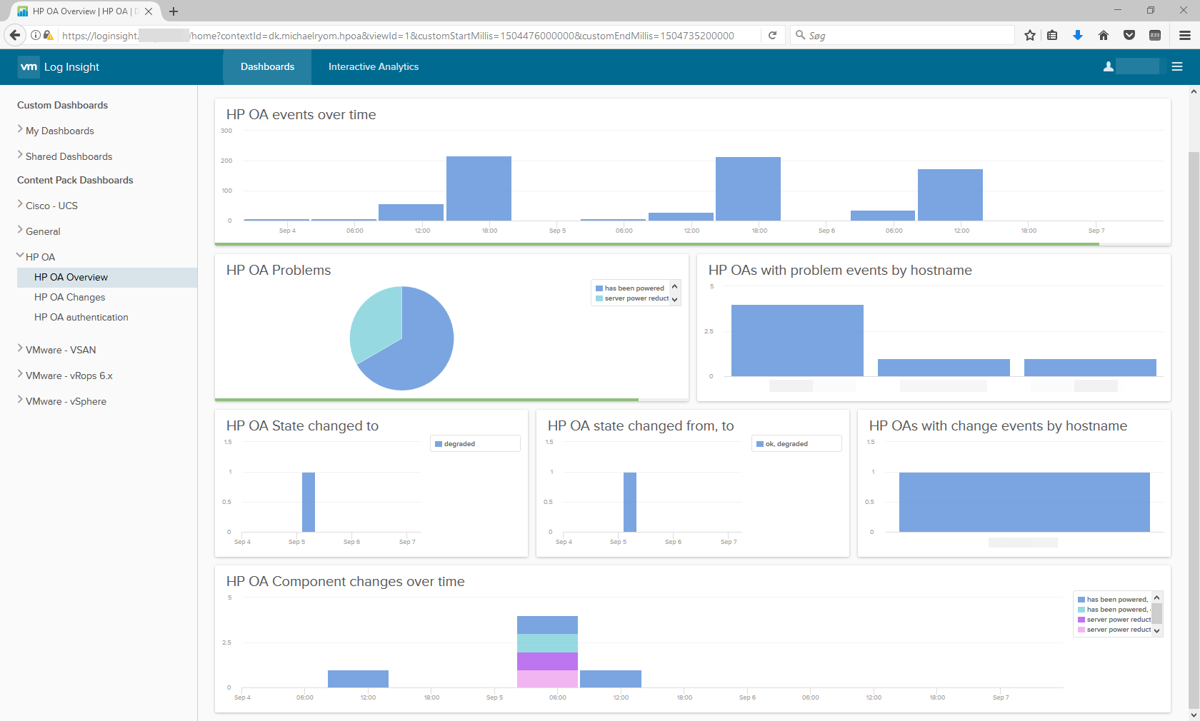 There is three dashboards in this content pack. The overview dashboard is meant to give you a quick overview of events and potential problems in your HPE OA environment, which you can dive deeper into. This should be your go to dashboards for troubleshooting issues with HPE OA.