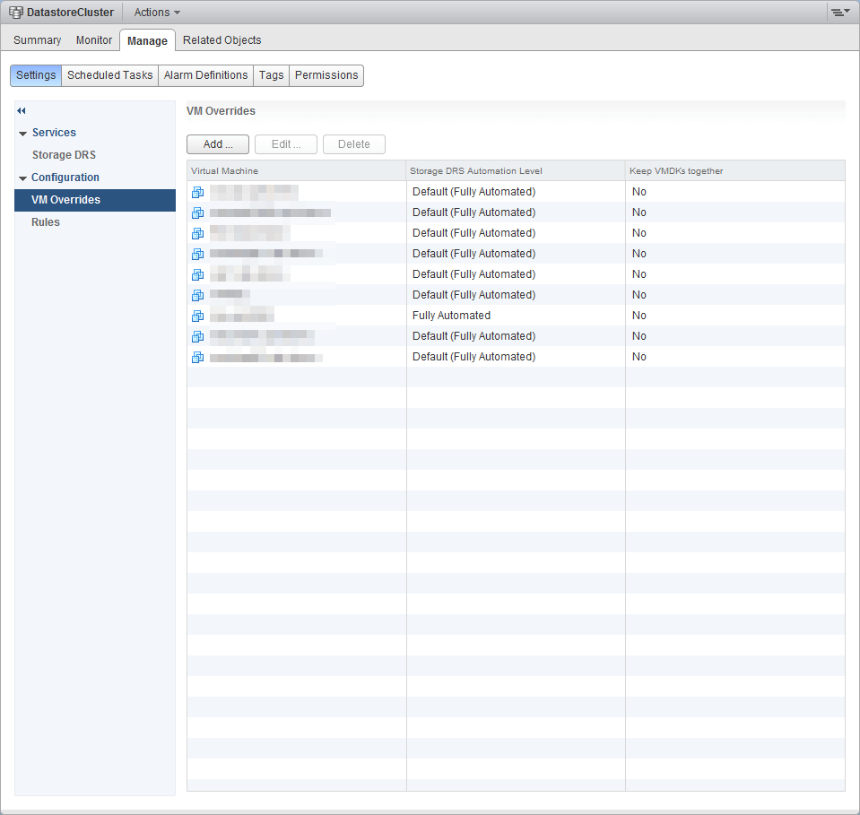 As seen in the screenshot. One of the VMs is listed with a Storage DRS Automation Level of Fully Automated, instead of Default. Which is what a VM would use by default if created via a GUI.