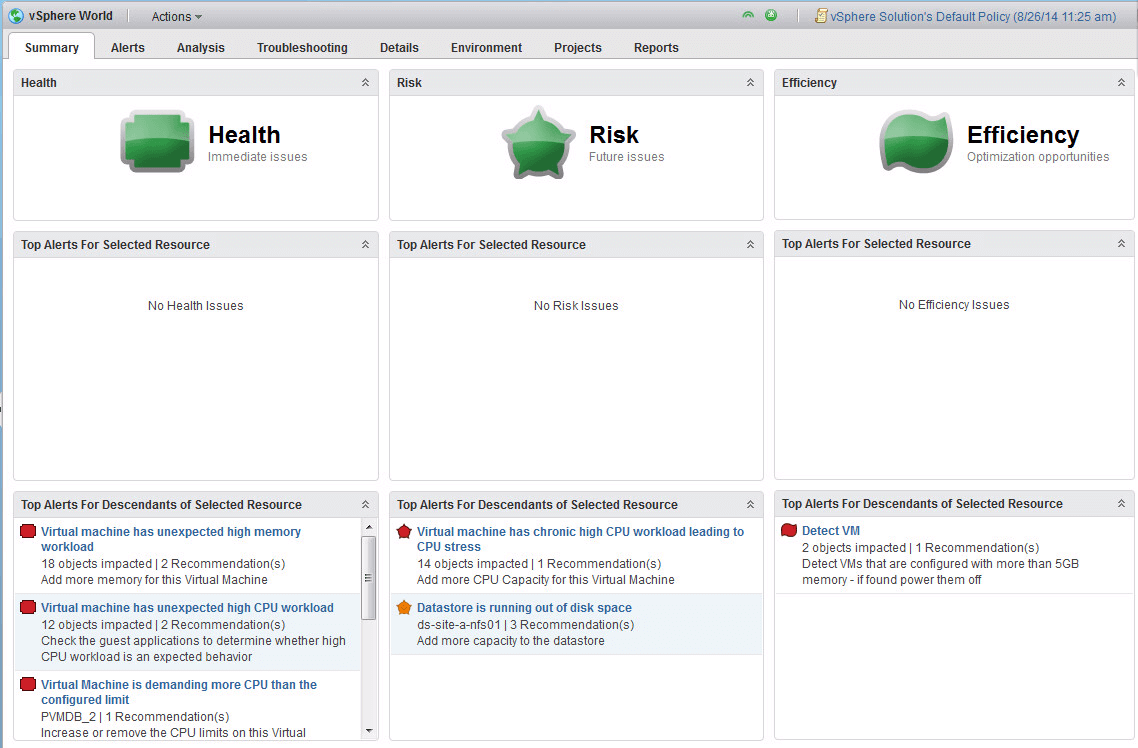 The summary tab, will be the first tab you see when ever you click on an object in vRops, be it vSphere world as seen below or a VM as I will show later or any other object for that matter. Summary is where we start.