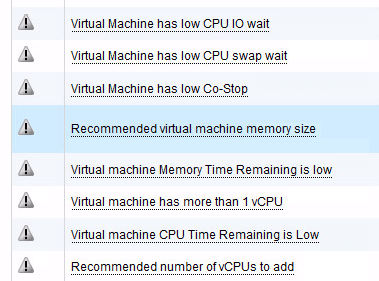 As the list is quite large for this VM, I have split it, so I better can discus the different parts. Looking at the screenshot above, it should be clear that there is quite a few error regarding CPU and memory and a single warning that a disk in the near future might run full.