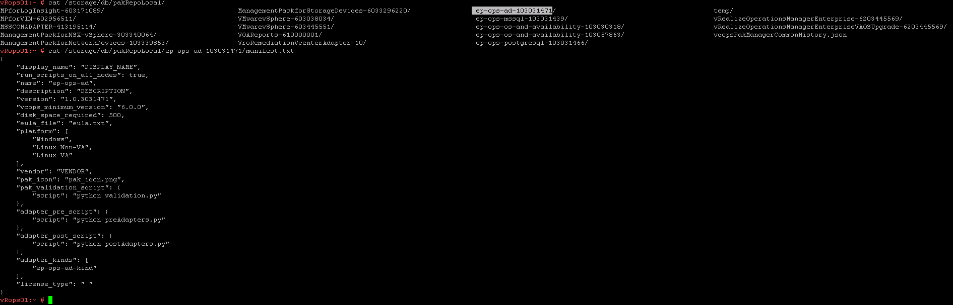Management Packs are located under /storage/db/pakRepoLocal/ as can be seen below by using "tab completion" (hit tab twice in a row). Now its just a matter of choosing the right management pack you want to uninstall and complete the path by adding manifest.txt to the end of the command line. The command cat will output the content of the manifest.txt file. From this we need the "name" in this case its "ep-ops-ad".