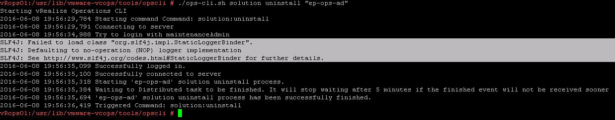 Now change directory to /usr/lib/vmware-vcops/tools/opscli/ and then type ./ops-cli.sh solution uninstall and then the name of the management pack. By the way quotations marks are needed as part of the command, so you might as well copy that from the output.
