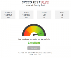As a last test to see how the connection is from the new location, I ran MegaPath's Speed test plus. I want to see how well the connection is in regards to jitter and throughput. It turned you to be quite excellent. With up and download speeds of up to 150Mbps and a jitter of three milliseconds I do not have any complaints.