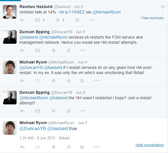 Frank Denneman and Duncan Epping raised two questions on twitter after I posted article. Seeing Franks question, I can only think I wasn't clear enough in the writing above, so hopefully this clarifies what happened and a possible cause of the error I had. Duncan was nice enough to reach you and clarify why HA attempted to restart the VM. Thanks both
