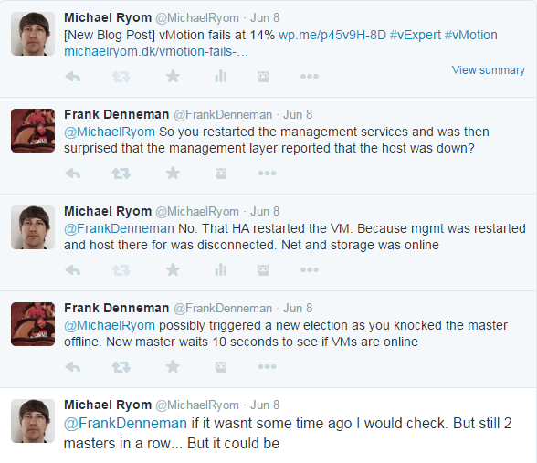 Now I knew it wasn't a VM or vMotion fault. But what was it then, well a clear answer I can't give you. But I then went on to close the case with GSS and they were nice enough to give me a call to hear how I've fixed the issue and they concluded that is was probably an issue with HA have a lock on these VM...