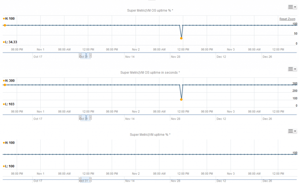 So the this given VM, I am showing you three Super Metrics. The two first are OS uptime and the last is VM uptime. As you can see only the OS was down and not the VM. This is one of the graph which can be used to stop pointing fingers at you if you are a VMware admin only. This clearly show the VM has been up and only OS was affected.
