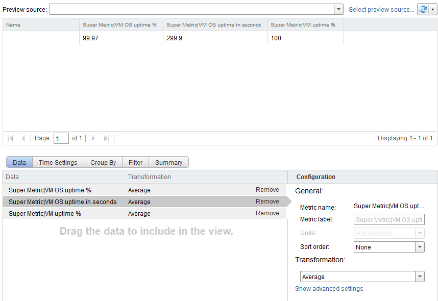 The only problem with graphs is that you need to read them and understand what it is showing to you. Not a good thing to send to customers or to the management layer. Here reports and view are gods. If you look at the view below. I have taken the same three Super Metrics as above and changed the transformation from last to average. As the values have been standardized it is now easy to read the uptime of the VM for that given time period. Again it can be seen that the OS have had down time, but this VM it self have had non. That is just the way we like it.