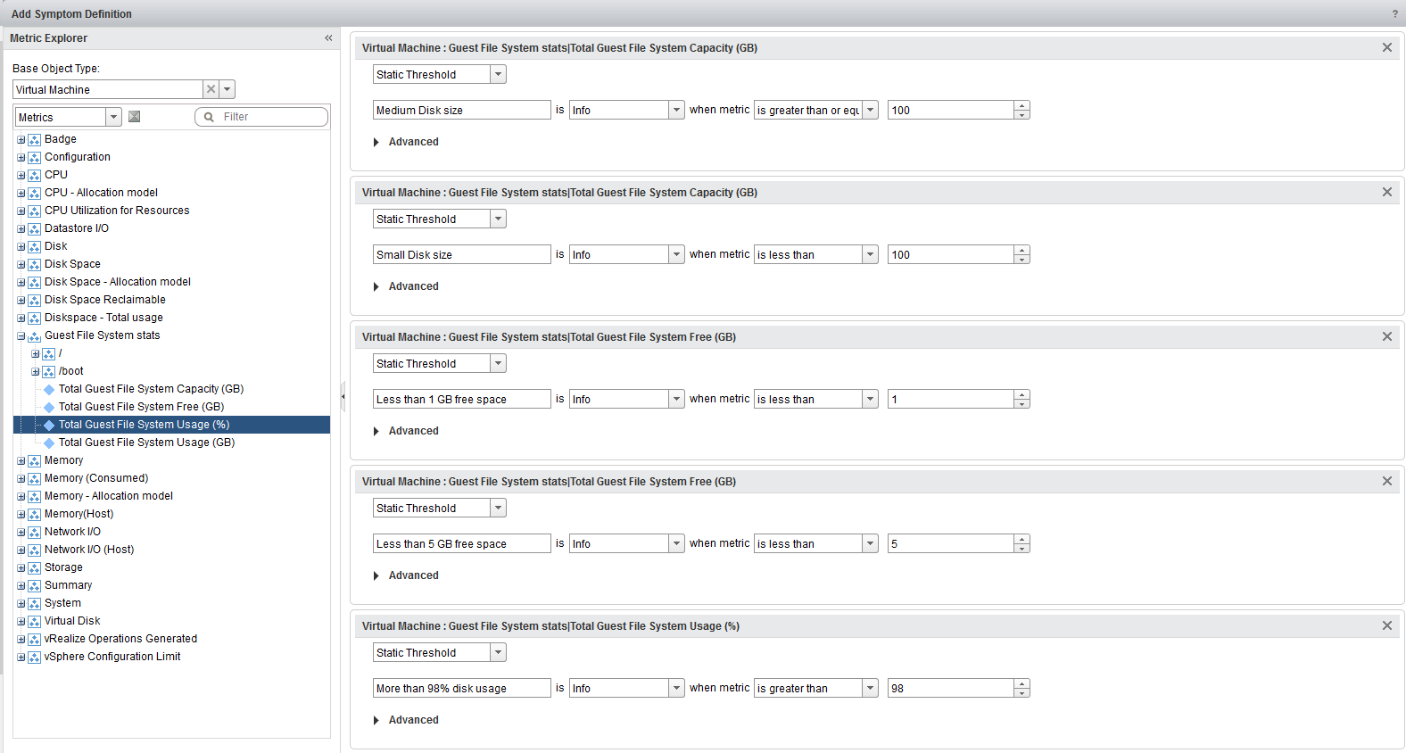 Medium Disk size = Guest File System stats|Guest File System Capacity (GB) | Equal or greater then 100GB Small Disk size = Guest File System stats|Guest File System Capacity (GB) | Less then 100GB Less than 1 GB free space = Guest File System stats|Guest File System Free (GB) | Less then 1 GB Less than 5 GB free space = Guest File System stats|Guest File System Free (GB) | Less then 5 GB