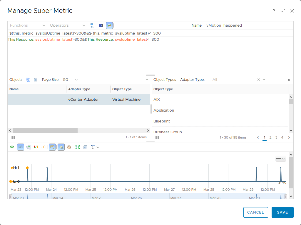 ${this, metric=sys|osUptime_latest}>300&&{this, metric=sys|uptime_latest}<=300Simply put if sys|osUptime_latest is more than 300 and sys|uptime_latest is 300 or less this metric will be one, meaning a vMotion has happened.